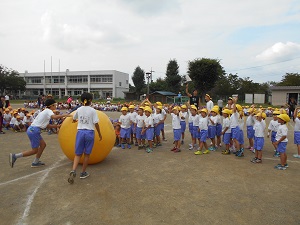 今日は月曜日。早速全体練習をしました。  1時間の練習でしたが、集中して取り組みました。 月曜の1時間目でしたが、体調が悪くなる児童が ほとんどいなかったのが、すばらしいです。 土日をきちんと過ごしていただいたおかげです。 保護者のみなさま、ありがとうございます。  昼休みは大玉送り。 がんばれがんばれ赤・黄・青! 明日はいよいよ、 ライオンキング、校庭デビューです! 雨になりませんように  |