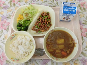 牛乳 麦ごはん カレーライス 大豆と枝豆のしゃりしゃり揚げ 三色サラダ