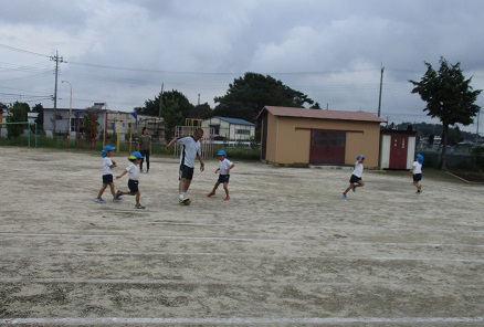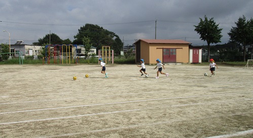 今日は、5歳児の女児と4歳児で1チーム。5歳児男児は5人ずつの2チームに分かれて試合形式でサッカーを楽しみました。