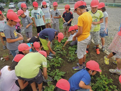 春、学年園にまいたインゲンが大きく育ちました。