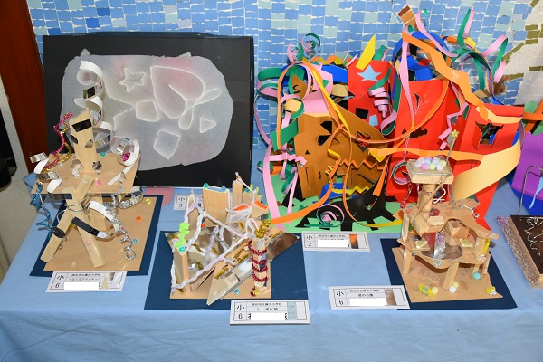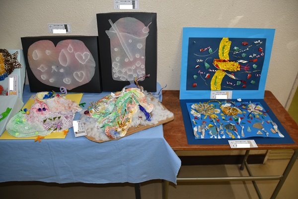 先週は児童生徒美術展の大里地区展が開かれました。藤沢小学校の児童の作品もたくさん出品しました。昨日搬出が終わり、作品が学校に戻ってきて、家庭科室前の廊下に展示されています。どの作品も力作です。