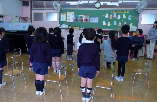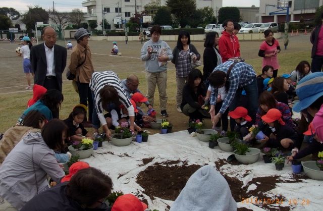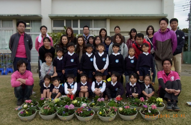 10月31日(土) 雲は多かったですが前日までの風が収まり、予定通り学校の庭で「キッズガーデニング」、続いて幼稚園に帰って「クラス参観」を行うことができました。講師により、