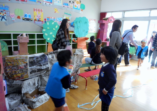 *お家の方に、段ボールで作った遊び場に参加していただきました。移動に電車を使ったり、一緒にゲームを