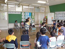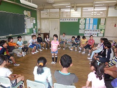 ↑ 上の写真は、クラスで歓迎のレクをしている風景です。