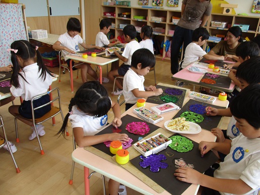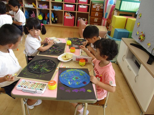 その後は、1学期に壁面飾りの花火を台紙に貼りました。