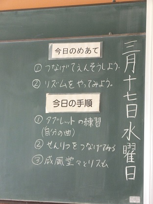 リズムの取り方の練習。先生が黒板に書いた音符の