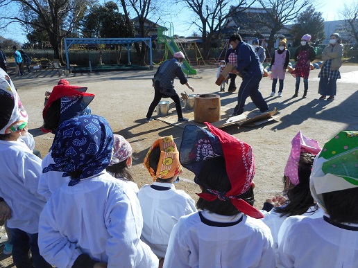「よいしょー」と掛け声をかけながら、おもちつきを楽しみました。