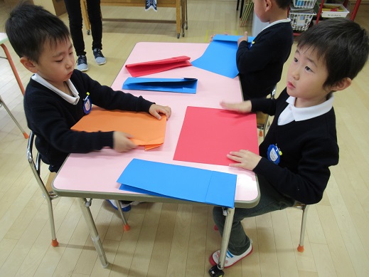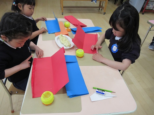 今日は、好きな色の画用紙を選び、それをこいのぼりの形に折ってのりで貼りつけました。