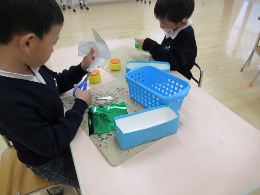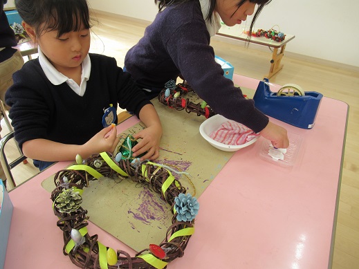 5歳児は、サツマイモのつるで作ったリースの土台にリボンを巻き、色をつけたドングリやマツボックリを飾りました。リースの真ん中には、四角錐の形に切った牛乳パックにホイル折り紙を貼り、周りにキラキラモールやポンポンをつけた飾りをつけました。