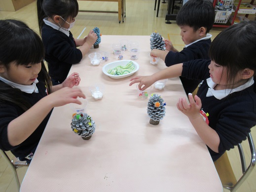 4歳児は、大きなマツボックリを使ってクリスマスツリーを作りました。