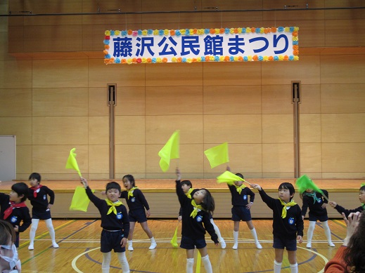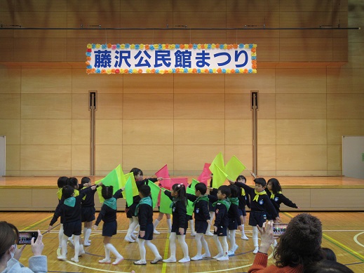 続いてダンスです。ゆずの「スマイル」の曲に合わせて、旗を使いながら踊りました。赤・黄・緑の3色に分かれて、旗を振ったり円になったり…。大勢の観客の前で、ドキドキしたと思いますが、とても堂々とダンスを披露できました!