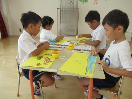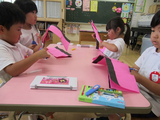 4歳児はピンクの画用紙にハサミを入れて、4つの面を作り、そこに好きな絵を描いていきます。