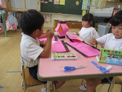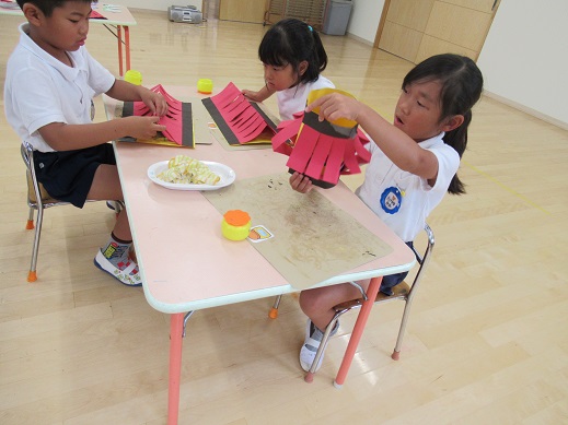 5歳児は、ちょうちんの中に入れる紙に好きな絵を描いていきます。そして赤い画用紙に細かくハサミを入れていき、2枚の画用紙を組み合わせてちょうちんの完成です。