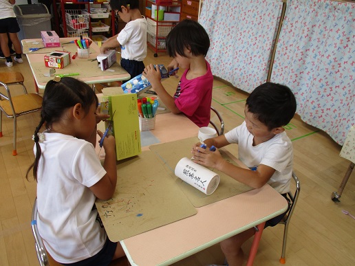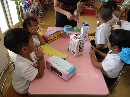 自分で好きな空き箱を選び、入り口や窓にするところを決めて、ハサミで切っていきます。入り口には好きな色の画用紙を貼り、窓には網をつけました。