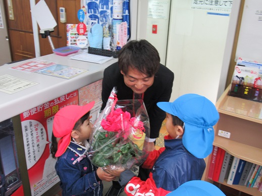 いつもお世話になっている、小学校の用務員さん・人見郵便局・藤沢公民館・農協へ行ってきました。みんなで挨拶をした後、質問をしたり、お花を差し上げたりしました。