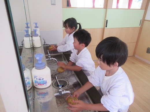 4歳児は、水道でじゃがいもをきれいに洗います。