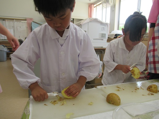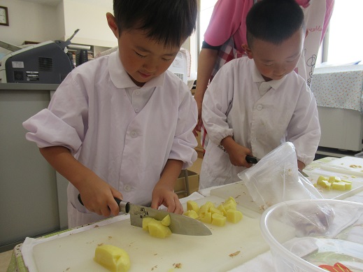 5歳児は、ピーラーでじゃがいもの皮をむいてから、包丁で小さく切っていきます。