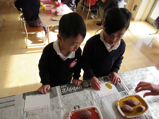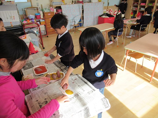 秋に幼稚園の畑で収穫したサツマイモを利用して、芋版にしました。