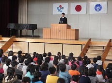 今日で2月も終わり、今年度最後の全校朝会が行われました。