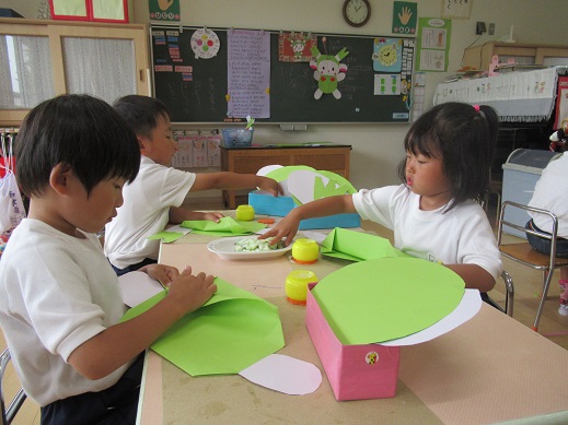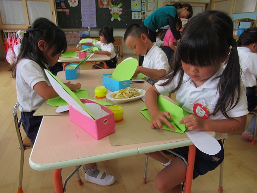 今日は4歳児・5歳児が一緒の製作活動をしましたが、4歳児ものりの使い方など上手になってきました!かわいいふっかちゃんの出来上がりが楽しみです。