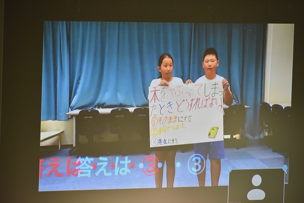 今朝は児童集会がありました。図書委員たちが工夫した動画を作って発表しました。