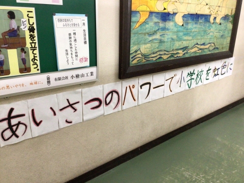 藤沢小学校の挨拶を増やそうとスローガンを決め、校舎内に掲示をしました!