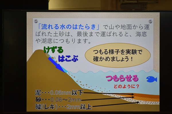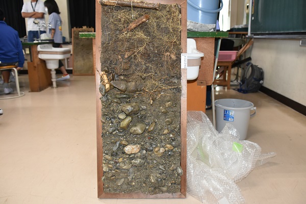 〇実験で流れる水の働きを再現してできた地層を観察しました。〇実際の地層も持ってきていただきました。