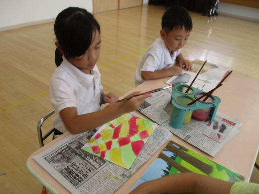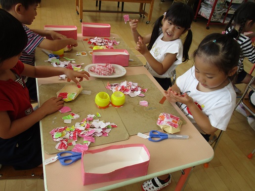 4歳児は、画用紙に赤や黄色の色を塗ったものをビリビリと破いて、それを貼りつけて完成です。5歳児は、クレヨンで格子状に線を書いたあと、絵具で色を塗り、リンゴの形に合わせて貼りつけて完成です。
