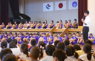 今朝は親善運動会・励ます会を行いました。  かっこいいね、6年生! おそろいのユニフォームが、似合っています。  6年生の長縄を見せてもらいました。 「速い!なわが見えない!」 「途中で止まっても、すぐに始めていた!」 「みんなで声をかけていた!」 そして一番多かった声は… 「ぼくも、わたしも、ああなりたい  」 「あこがれ」の気持ちをもてる先輩が近くにいる。 すてきなことですね。  今日の体育。 いつもよりも、気合いが入ったようです。 |