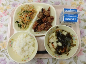 今日の給食は、ごまたっぷりの甘辛いタレに