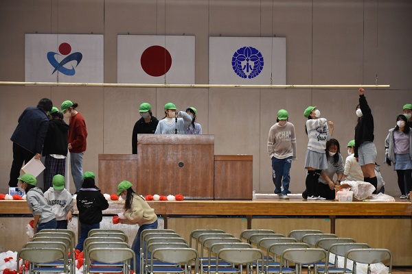 〇卒業式用のお花を並べます。 〇レッドカーペットをきれいに敷いて、壇上も準備が進みます。