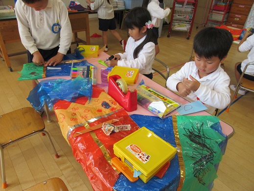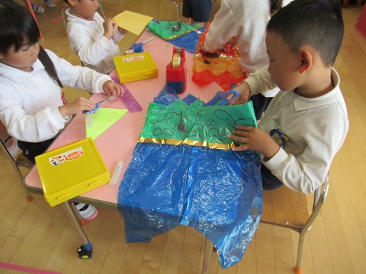 昨日作った、自分の衣装を着て、みんなで仮装しました。春の運動遊びに使った衣装に自分で飾り付けをして、オリジナルの衣装を作りました。