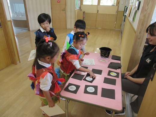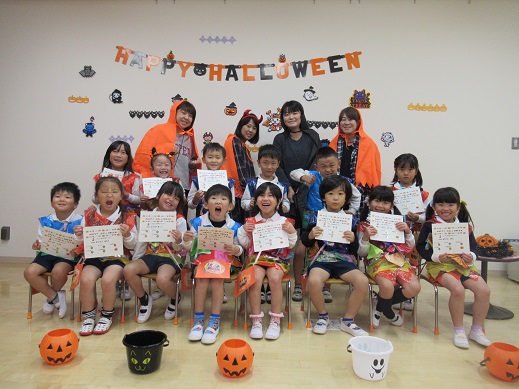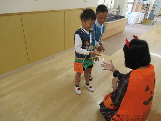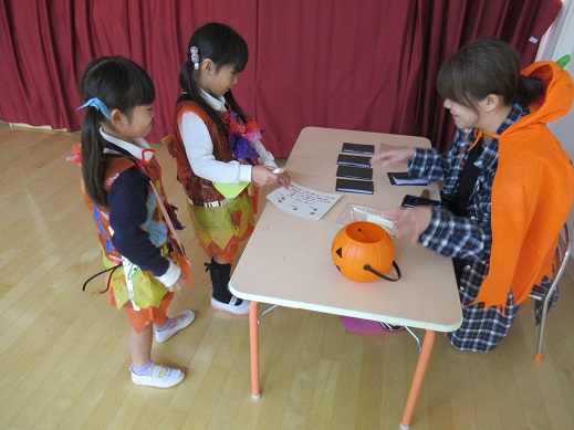 各コーナーでゲームをクリアして、「トリック オア トリート」と合言葉をいうとお菓子がもらえます。みんな、張り切ってゲームを楽しみました。たくさんお菓子がもらえて、みんなニコニコです!!