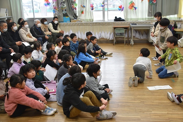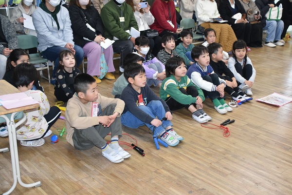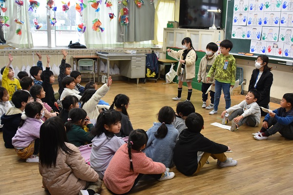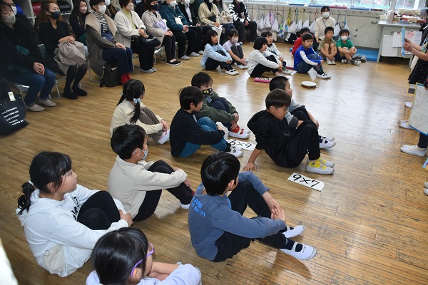 〇1年1組 クイズを出しています。 〇いい姿勢で聞いていますね。