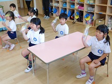 「おもちゃのチャチャチャ」と「アイアイ」の歌を歌いながら、みんなでマラカスを鳴らしてあそびました。