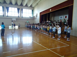 今日の6時間目、音楽朝会に向けて体育館で練習を行いました。
