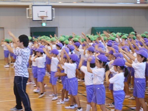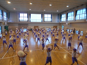 今日は全校で石投げ踊りと、4年生で花笠音頭の練習をしました。