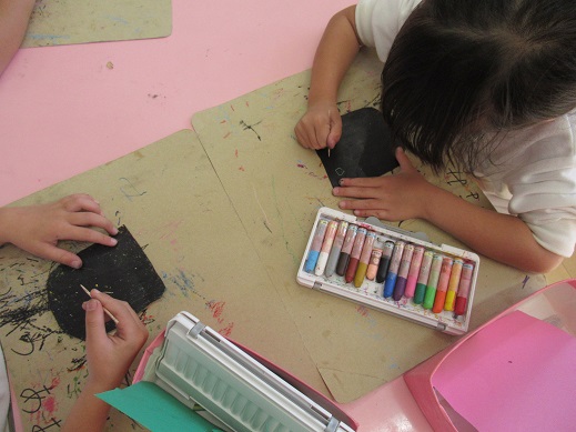 まず、好きな色の画用紙でふくろうの体を切っていきます。次に、白い画用紙にクレヨンで好きな色に塗ったあと、黒のクレヨンで塗りつぶしていきます。最後につまようじで線を書くと、素敵なひっかき絵のできあがりです。