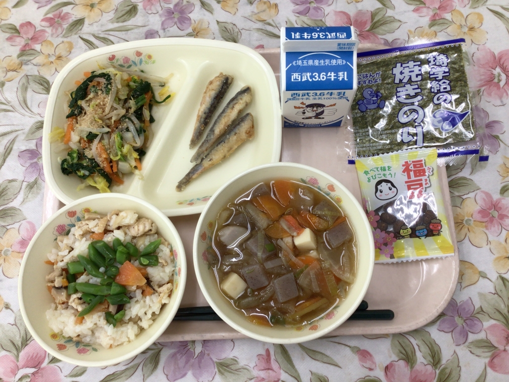 牛乳 かて飯(恵方巻き) 焼き海苔 小いわしの唐揚げ ごま和え(冬野菜) けんちん汁 福豆 節分という言葉は、「節(ふし)」と 「分(わかれ)」から成り立っており、 季節を分けるという意味を持っています。 毎年2月3日ごろにおこなわれる年中行事です。 「一年間健康に過ごせるように」という願いを込めて 「悪いもの」を追い出す行事とされています。 豆まきをしたり、恵方巻きを食べたり、 いわしを飾ったりと古くから伝わる風習が数多くあります。 今年の恵方は、南南東です。給食では自分で海苔巻きにして、 恵方巻を祈りながら食べてくれたと思います。 |