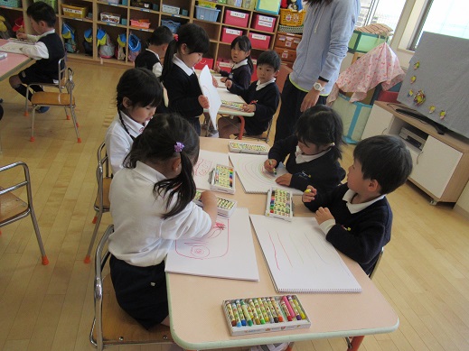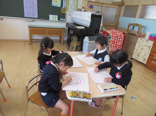 今日はみんなでクレヨンを使ってみました。4歳児は初めてのクレヨンだったので、みんなで「どんな色かな?」と一本一本取り出しながら、きれいな虹を描いていきました。