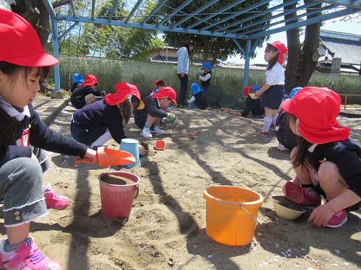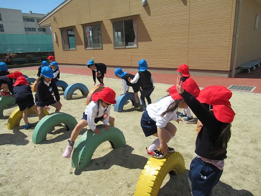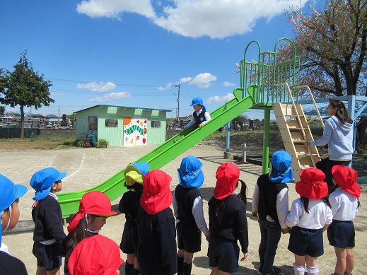 その後は、滑り台やタイヤ飛びなど、遊具の使い方やルールをみんなで確認しながら、園庭でのびのびと遊びました!