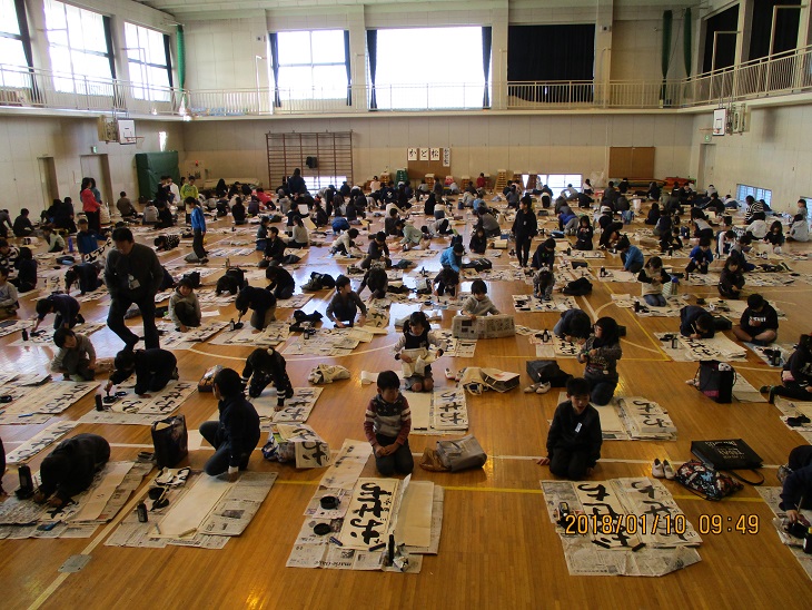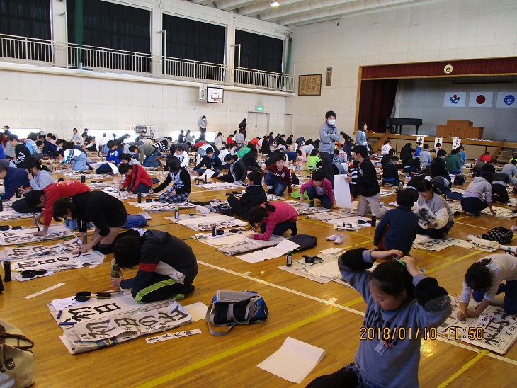 学校の様子ですが 1月10日 書きぞめ制作会実施 体育館で、1・2校時は3・4年生、3・4校時は5・6年生がフロア一杯に広がって、真剣に書きぞめに取り組んでいました。 現在は、書きぞめの選手が、深谷市の書きぞめ展、県展に向けて、練習を進めています。