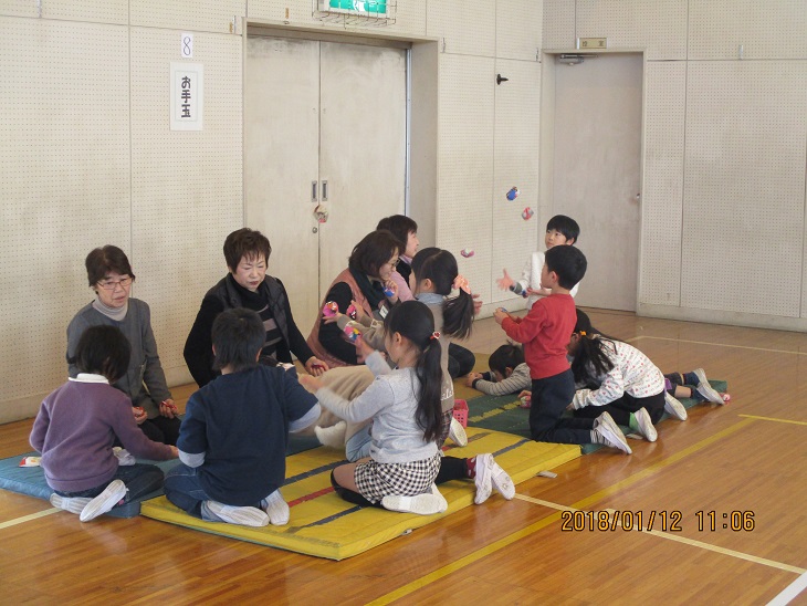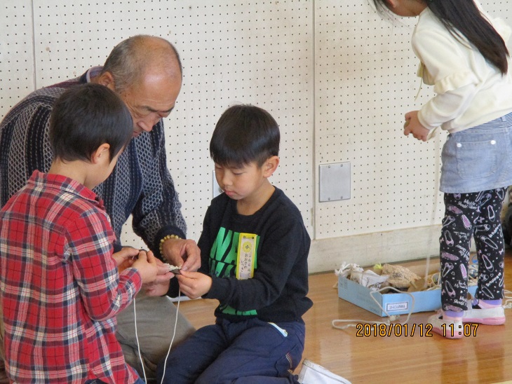 1月12日 1年生昔の遊び おじいちゃん、おばあちゃんや保護者の皆さんに呼びかけて、体育館ではねつき、コマまわしを始め、たくさんの昔ながらの遊びを楽しんでいました。(私も初めてベーゴマが回せました!)