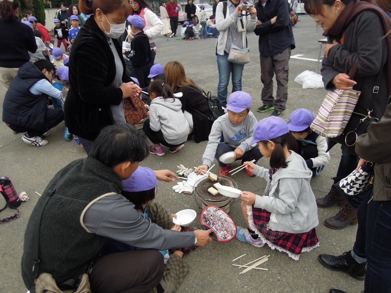 保護者の皆さんと一緒に七輪を使って餅焼きをする昔の生活の体験活動を実施(3年生)したり、