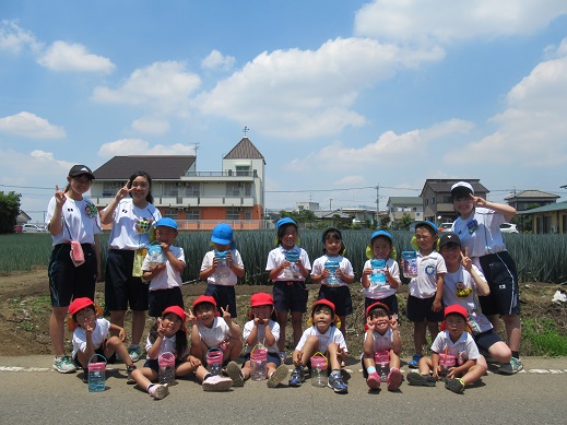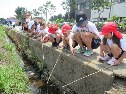 一人一竿ずつもって、ザリガニ釣りに挑戦です。煮干しをつけた竿をたらし、ザリガニが食い付いてくるのをじっと待ちます。「なかなか釣れないよー」としびれを切らしてしまう子もいる中で、やはりじーっと動かずに根気強く待っている子の竿にはザリガニがやってきます。
