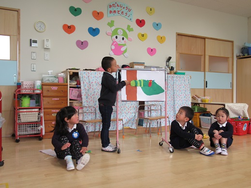 最後には、進級児からメダルのプレゼントと「はらぺこあおむし」のペープサートの発表もありました。