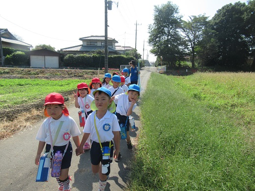 今日は虫捕り遠足。天気も良く、みんな朝からワクワクしていました。場所は、幼稚園から15分ほど歩いたところにある原っぱです。