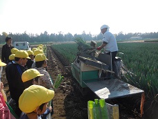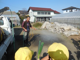 〇今日は、社会と総合の授業との関連で、ネギ農家の作業現場の見学に行って