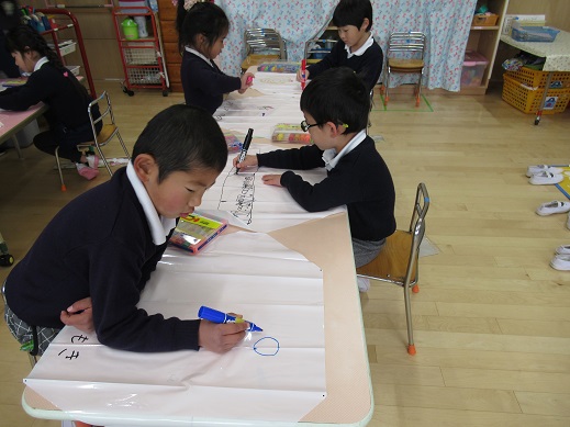 今日はみんなで凧作りをしました。自分の好きな絵を凧に描いて、組み立てていきました。思い思いの素敵な凧が出来上がりました!
