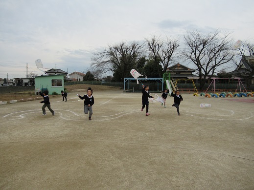 園庭に出て、早速凧あげに挑戦。風も吹いていたので、空高くあがり、みんなで楽しみながら遊びました。